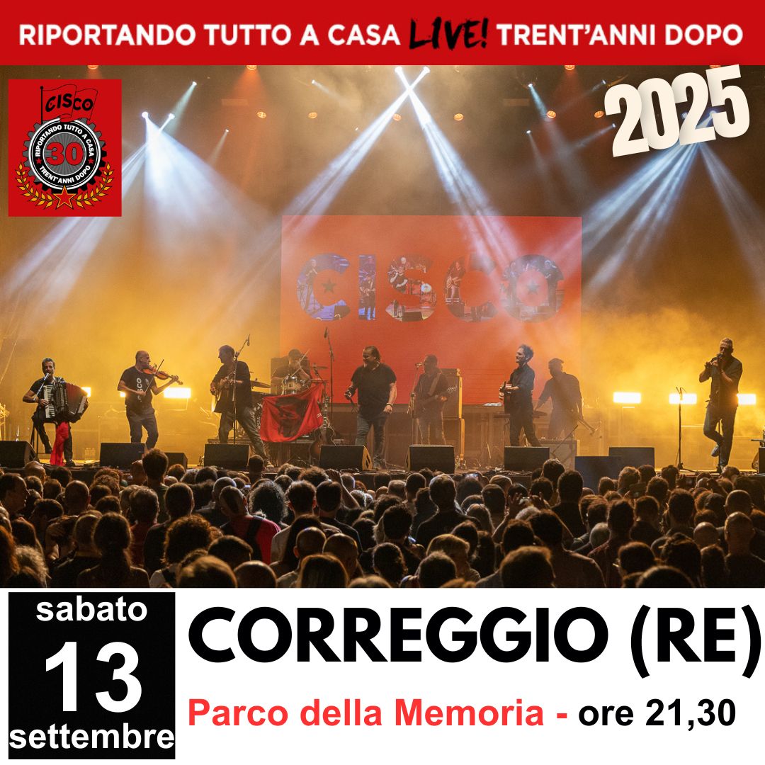 Parco della Memoria Parco della Memoria, Correggio, Reggio Emilia, ItalySabato 13 settembre Cisco e il suo “Riportando tutto a casa tour 30 anni dopo” tornerà a casa , infatti suoneremo presso il Parco della Memoria a Corregio RE , per una nuova tappa del tour che sarà una festa! Sarà un’altra ottima occasione per fare festa cantare e ballare insieme le canzoni storiche dei primi [...]